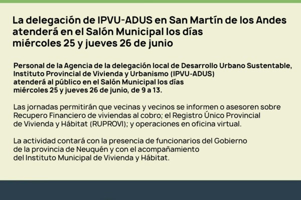 Personal de la Agencia de la delegación local de Desarrollo Urbano Sustentable, Instituto Provincial de Vivienda y Urbanismo (IPVU-ADUS) atenderá…