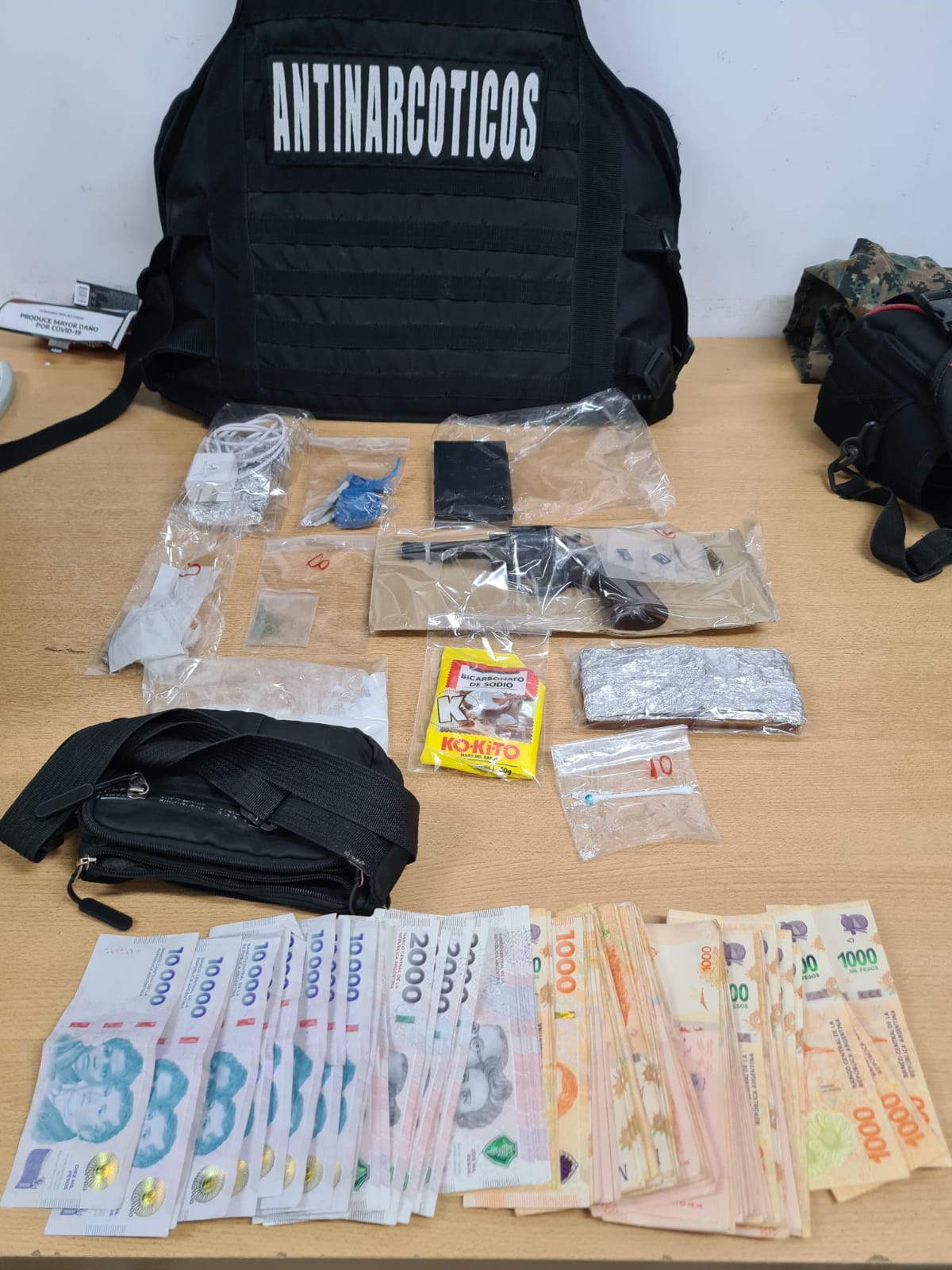 El allanamiento se llevó a cabo el día sábado pasado. En el domicilio allanado se secuestraron varias dosis de estupefacientes, un arma de fuego, elementos de estiramiento y fraccionamiento, una sierra circular aparentemente vinculada a un robo en la ciudad.