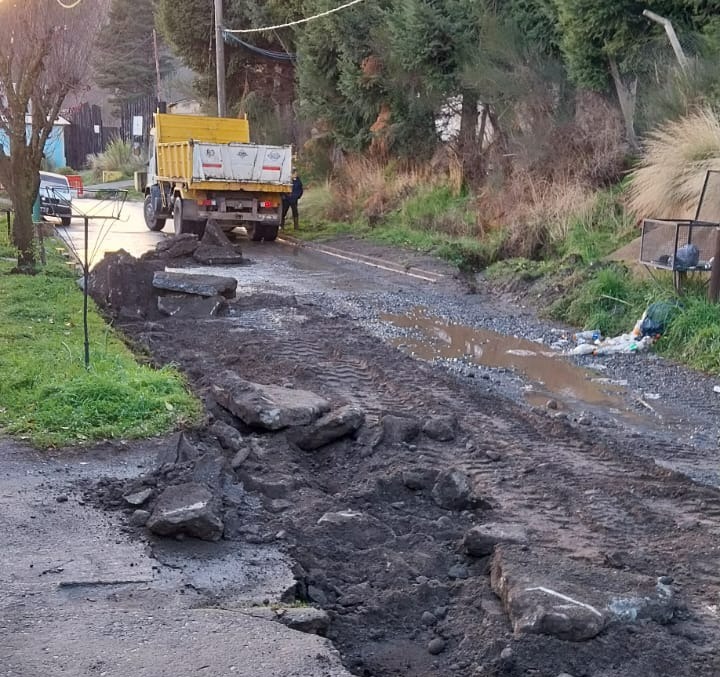Las tareas de este día comenzaron frente al Sport Club Arenal Pádel, donde una motoniveladora, un camión y una retroexcavadora realizan el trabajo previo a colocar hormigón.