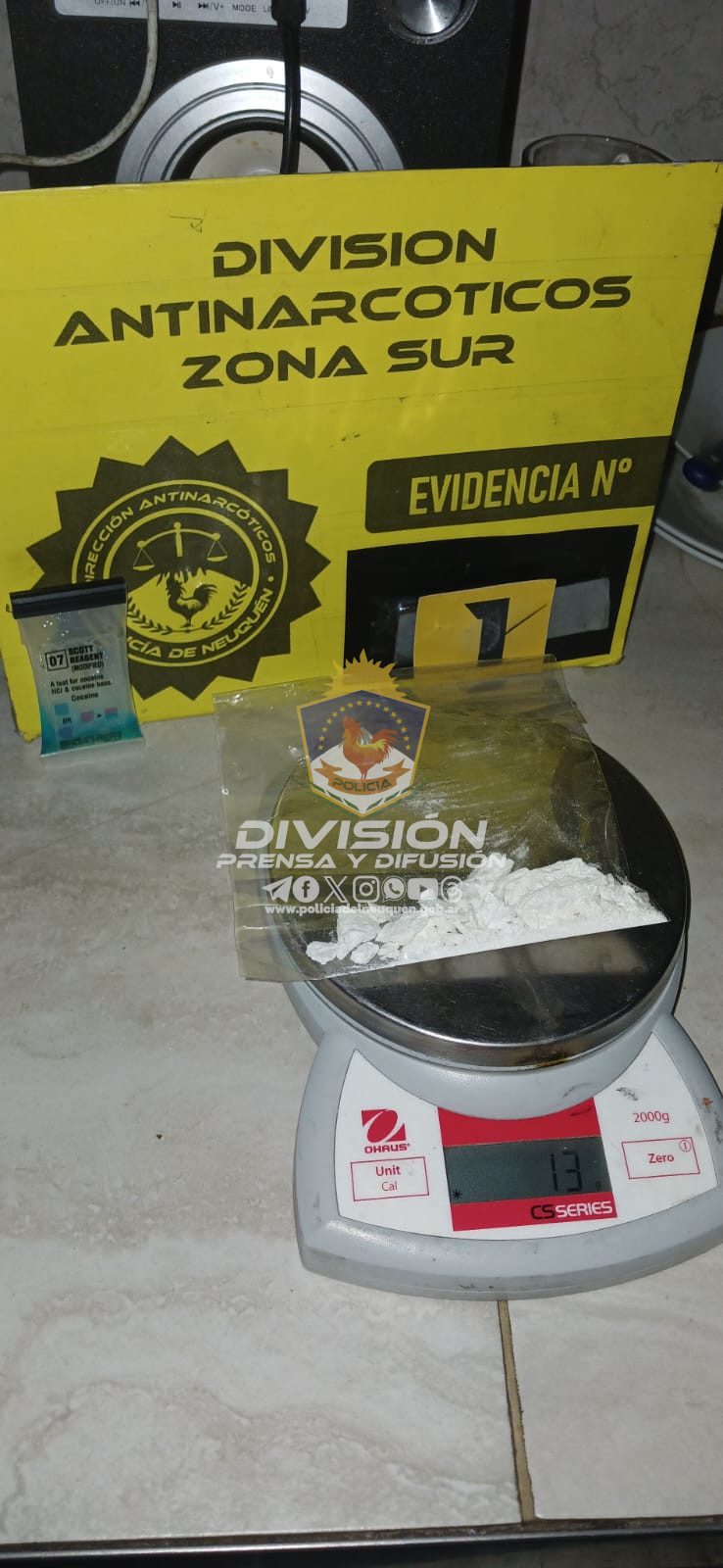 Tras el registro del inmueble los policías hallaron sustancia estupefaciente y una balanza digital, por lo que dieron intervención a efectivos de la División Antinarcóticos, quienes secuestraron Clorhidrato de Cocaína.