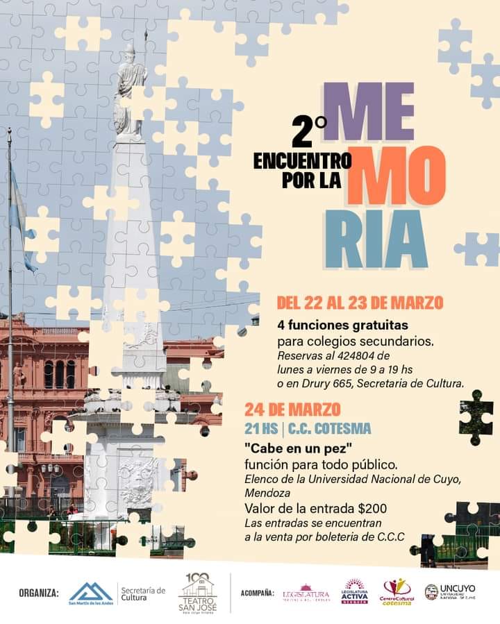 La propuesta en este 2° Encuentro por la Memoria, es realizar funciones gratuitas para escuelas secundarias con participación de compañías locales como nacionales, creando un espacio donde los alumnos puedan debatir y compartir diferentes miradas de un mismo hecho histórico, generando un aprendizaje significativo para su saber.
