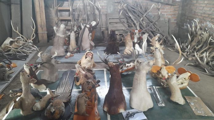 En total se reunieron más de 20 cabezas de animales taxidermizados entre los que destacaron una cabeza de leona africana, una de cerdo africano, antílopes, muflones, seis peludos y cinco cabezas de ciervos colorados. Además, hallaron tres cráneos de jabalí europeos, un cuero de puma, un faisán real, 33 astas de ciervo y alrededor de 18 kilos de recortes de astas. También se incautó un arma de fuego con silenciador y municiones.