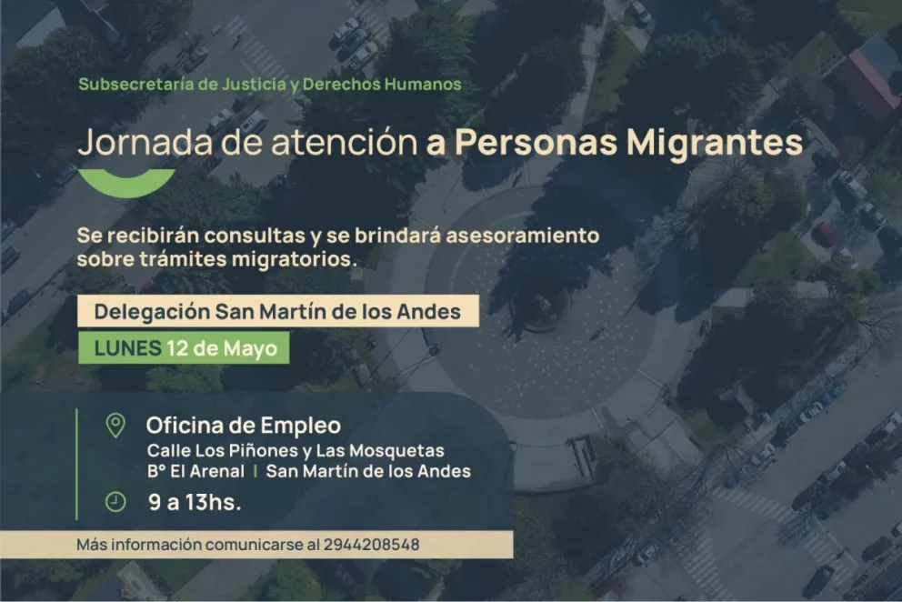 La subsecretaría de Justicia y Derechos Humanos, dependiente del Ministerio de Gobierno, realizará una jornada de atención a personas migrantes en la ciudad de San Martín de los Andes, con el objetivo de brindar asesoramiento y responder consultas sobre trámites migratorios.
