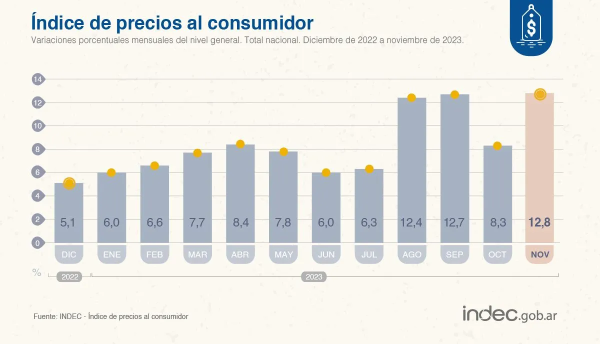 La inflación de noviembre fue de 12,8% y acumuló 160,9% en el último año. En los primeros once meses del año, el Índice de Precios al Consumidor (IPC) acumuló 148,2%, informó el INDEC.