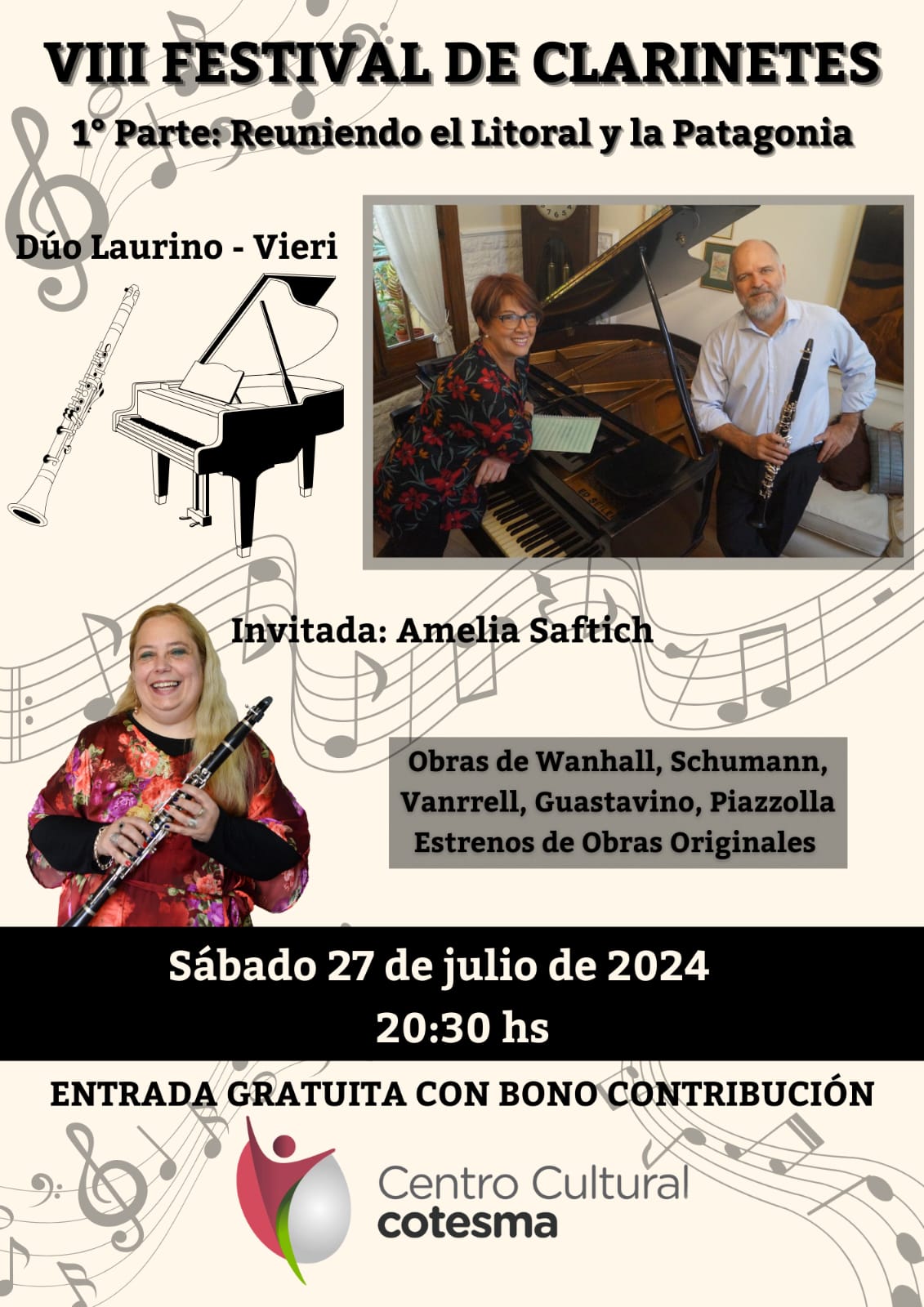 Este año habrá dos presentaciones en julio: viernes 26 y sábado 27 con el dúo de clarinete y piano Laurino- Vieri (provenientes de Santa Fe). Mientras que la segunda parte del Festival se desarrollará en octubre con la presencia de otros destacados maestros.