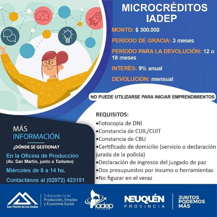 La Subsecretaría de Producción, Empleo y Economía Social informa que el Instituto Autárquico de Desarrollo Productivo (IADEP) ofrece una línea de crédito destinada a fortalecer emprendimientos locales, con montos de 300 mil pesos, tasa de interés mínima del 9 por ciento y financiación de hasta 18 meses.